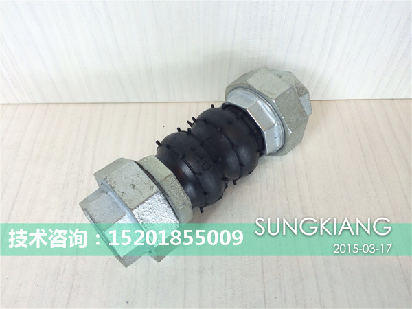 1、絲扣橡膠接頭,采用天然合成橡膠生產,內加尼龍簾線,承壓16kg,絲扣采用瑪鋼材質生產,這種產品的優點就是:減振效果比不銹鋼的減振效果好30%,隔音效果比不銹鋼軟連接好50%,很多對環境要求高的項目都會采用橡膠軟連接。缺點:安裝技術要求高,補償量小,壽命:3~5年。